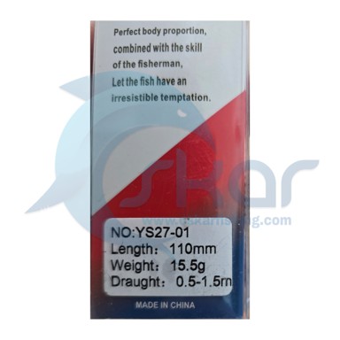 ماهی استخانی مصنوعی YS27-01 از برند KAIDA با طول 11 سانتی متر و وزن 15.5 گرم دارای دو عدد قلاب سه شاخه در پایین و انتهای آن . دارای حلقه بر روی سر جهت اتصال به نخ یا هرزگرد یا سیم بکسل می باشد. دایو یا عمق مناسب حرکت محصول 0.5_ 1.5 متر است که بسته نوع و سبک اسپین شما متغییر است. مناسب برای انواع ماهی های گوشخوار مهاجم (اردک، سوف، قزل ....)