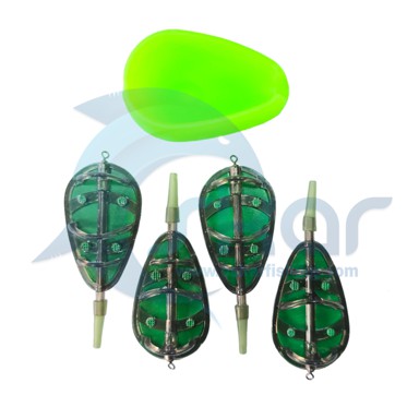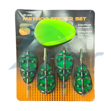 ست متد فیدر 4 عددی همراه با قالب جهت متراکم کردن مواد فیدری بر روی فیدرها مورد استفاده قرار می گیرد. ابتدا مواد فیدر (مواد طعمه پاشی) درون قالب پر می شود سپس فیدر داخل قالب فرو می رود. با فشار انگشت در پشت قالب مواد به صورت کاملا متراکم بر روی فیدر قرار می گیرند و از قالب جدا می شوند. وزن فیدرهای موجود در بسته: 30گرم؛ 40گرم، 40گرم و 50گرم.